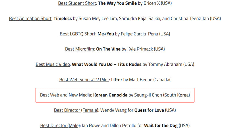 공지사항 전승일 작품 <금정굴 이야기> Independent Shorts Awards 수상 미메시스TV 2021. 12. 6. 14:02 전승일 감독 제노사이드 다큐멘터리 애니메이션 <금정굴 이야기> LA Independent Shorts Awards Silver Awards 수상